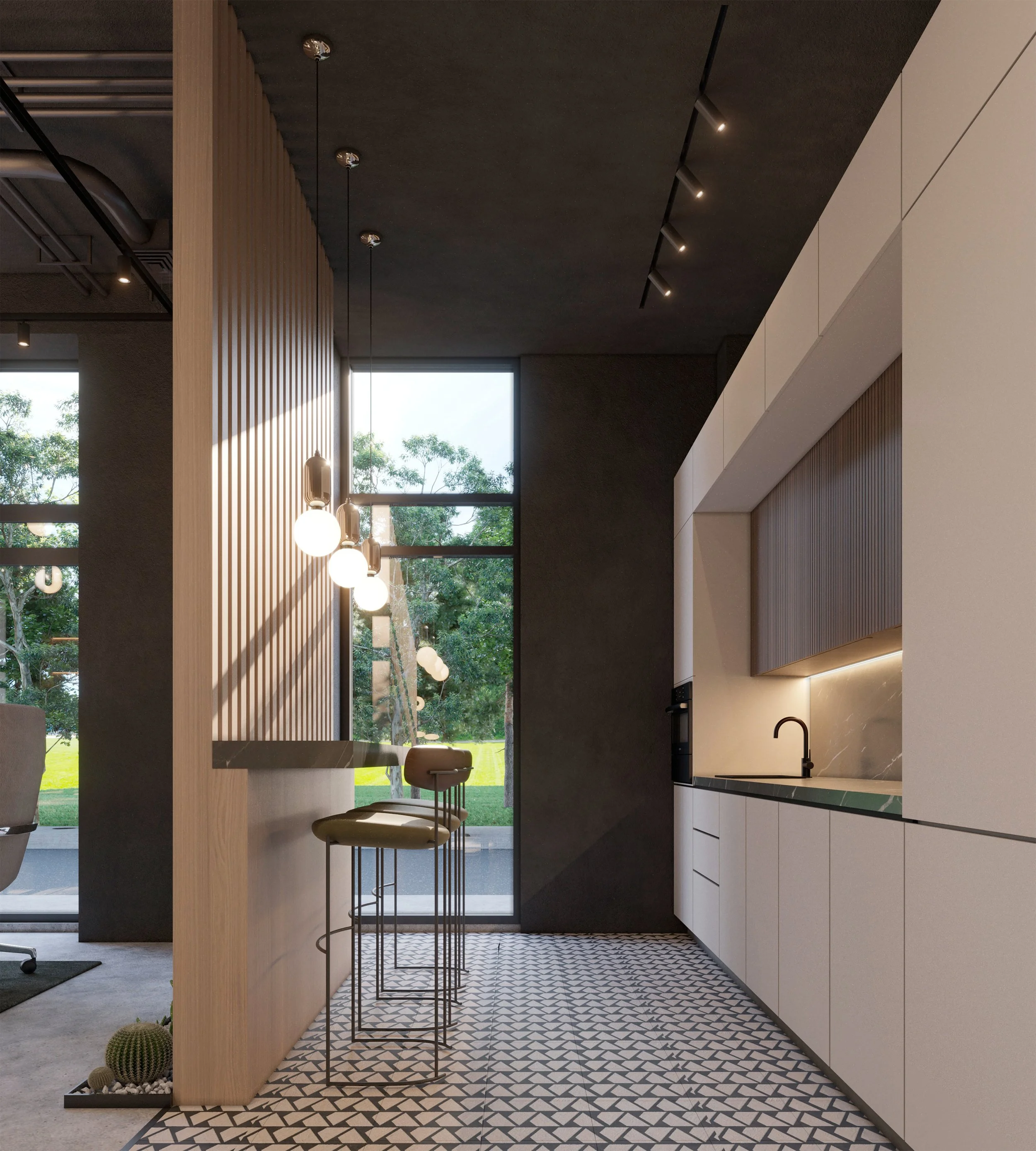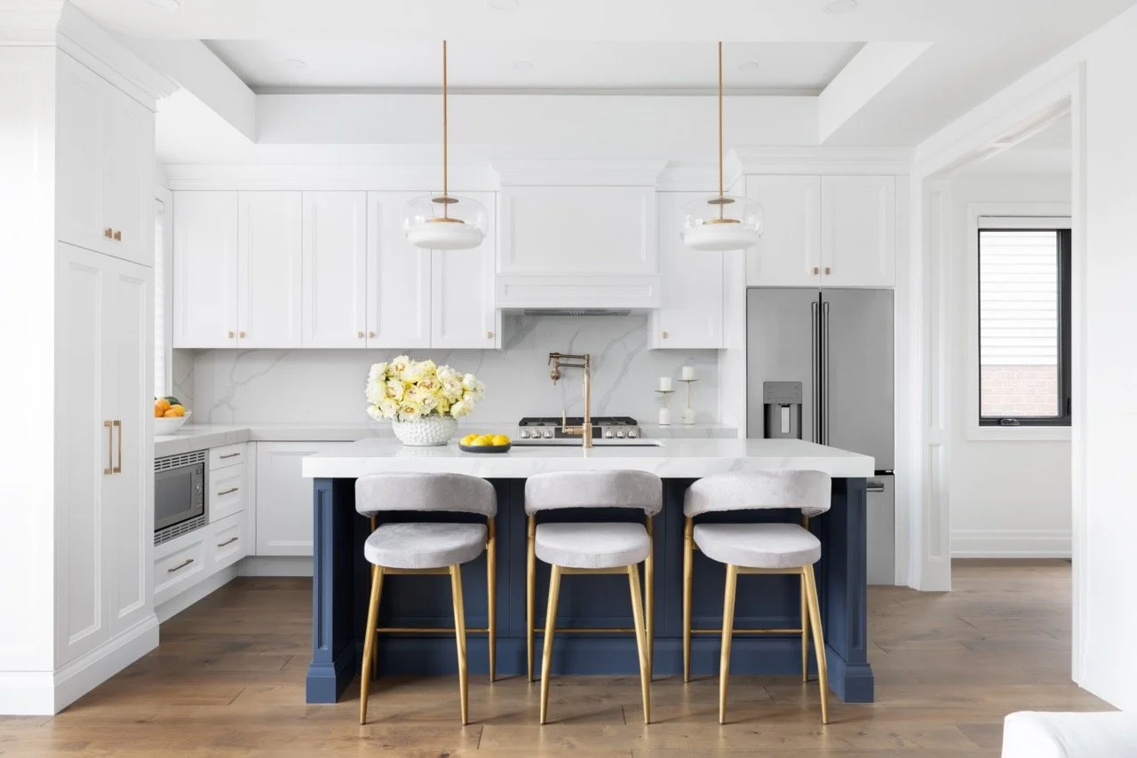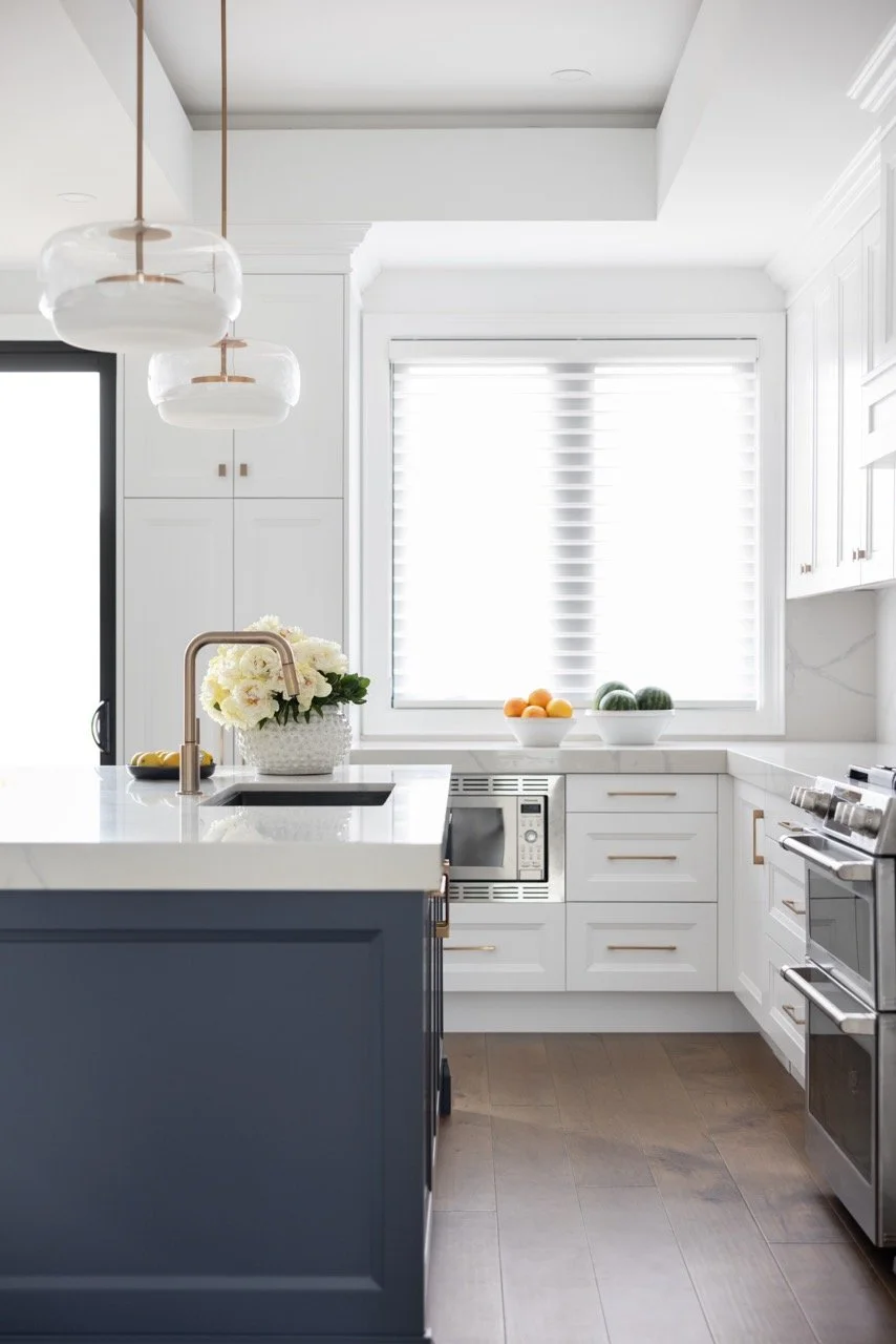 Moody coastal hues entwine with industrial elements in this decorous Toronto kitchen.